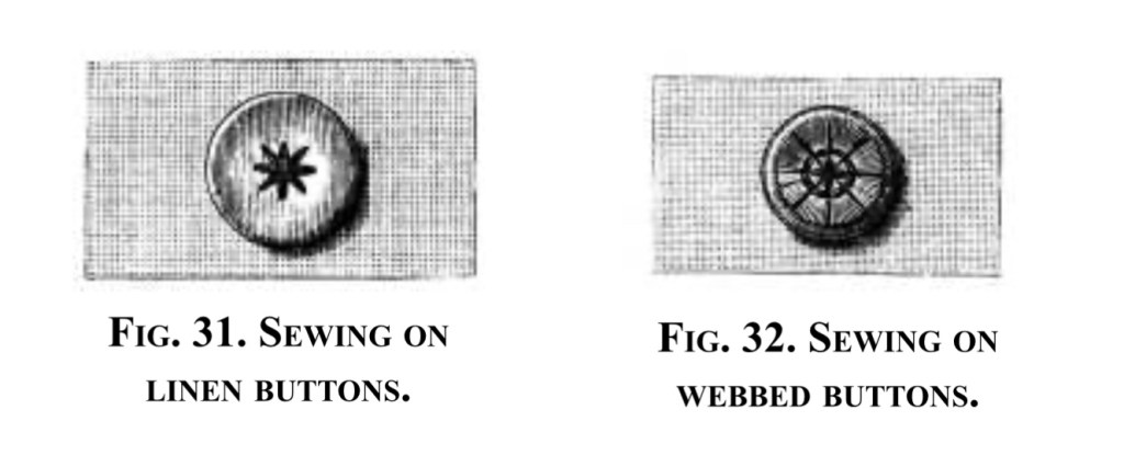 Therese de Dillmont’s beautiful illustrations on the art of sewing on buttons.