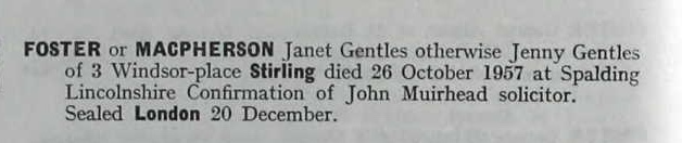 When we find Janet (aka Jenny) Foster in the death records in the late 1950s she is recorded as ‘of … Stirling’. Her address given as “3 Windsor-place Stirling”, yet she died in Spalding, Lincolnshire.