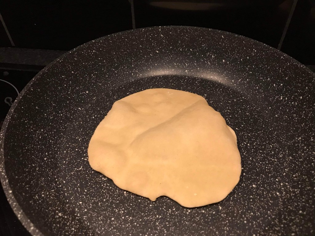 When you have rolled one, the pan should be really hot. Pat any excess flour off the chapati with your hand and then drop it into the pan